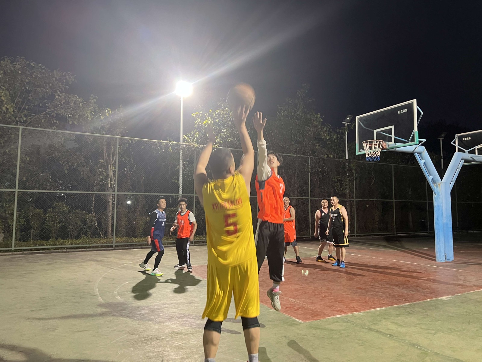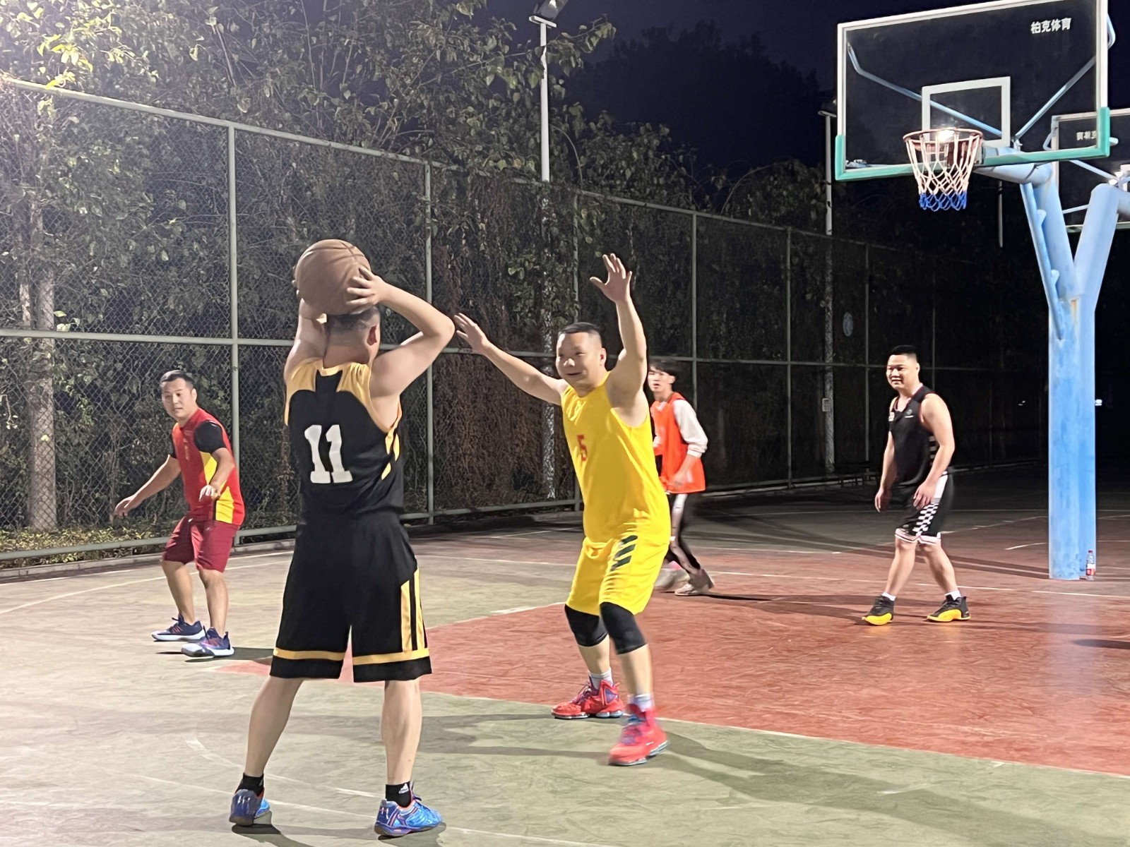 球场上,两队球员展现了高度的热情和出色的球技,他们时而进行精妙的转身跳投,时而远距离投篮,为观众带来了一场精彩的比赛,整个篮球场都弥漫着快乐的氛围。